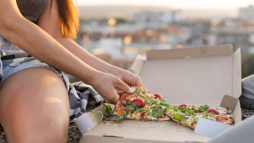 femme manger pizza dehors