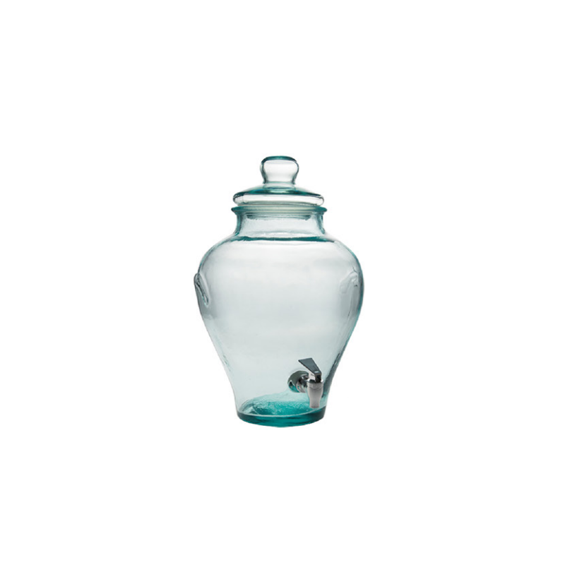 Fontaine en verre avec son couvercle assorti : très pratique elle se remplie par le haut : vous pouvez y insérer de gros fruits.