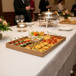 Fabriqué en carton kraft robuste, ce plateau est parfaitement adapté à un usage professionnel intensif. Sa rigidité assure une excellente tenue lors du service, répondant aux exigences de stabilité et de praticité des métiers de la restauration, des traiteurs et des organisateurs d’événements d'entreprise.