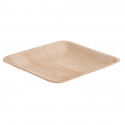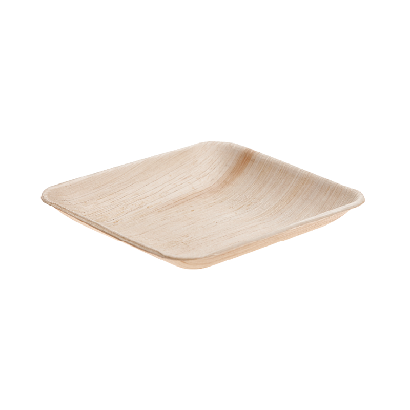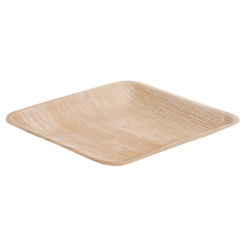 Assiettes carrées en palmier, robustes et élégantes, biodégradables et compostables, parfaites pour les présentations culinaires écologiques.