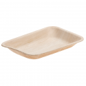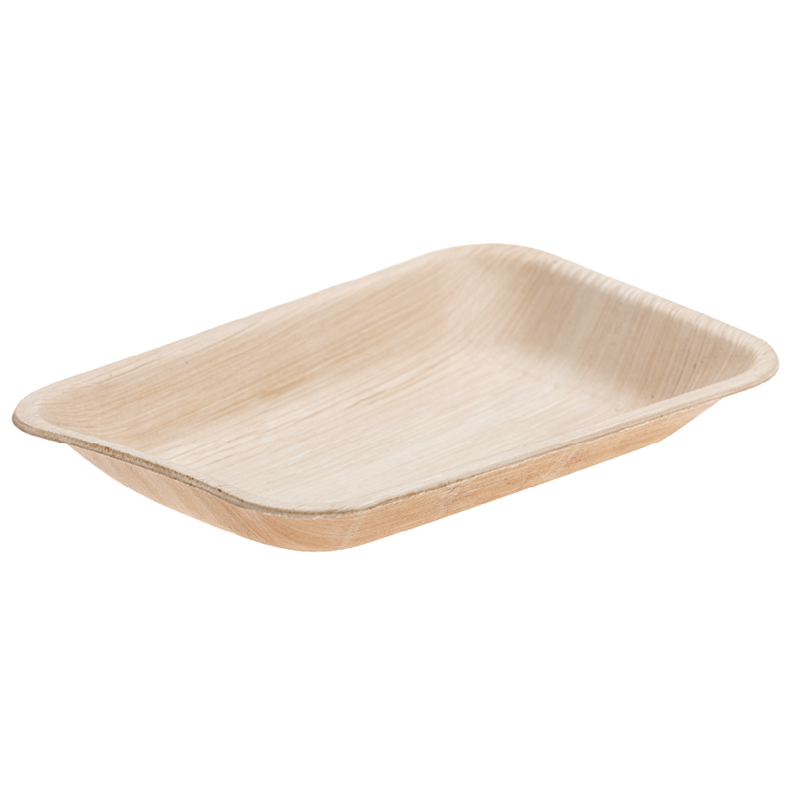 Barquette rectangulaire en palmier, robuste et esthétique, biodégradable et compostable. Idéale pour les portions moyennes lors d'événements et buffets.