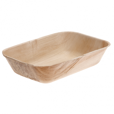 Barquette rectangulaire en palmier, robuste et écologique, idéale pour les plats à emporter et les événements. Biodégradable et compostable.