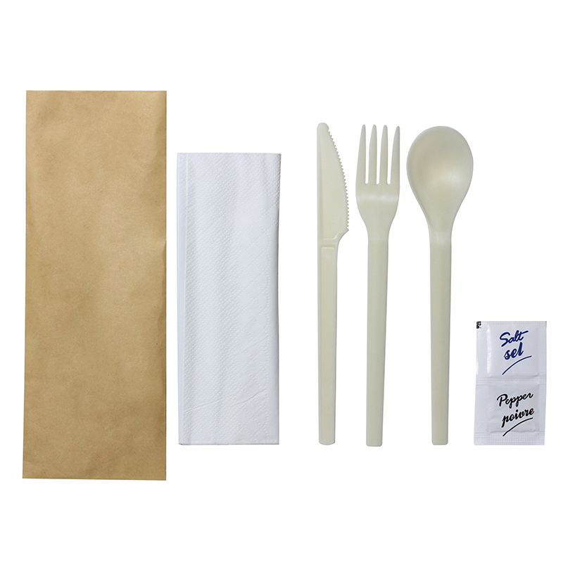 Le set 6 en 1, qui contient une cuillère, une fourchette, un couteau, une serviette, un sachet de sel, un sachet de poivre dans une pochette en amidon de maïs.