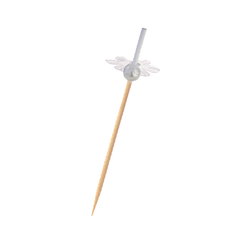 Pic perle fleur en bois avec perle blanche et fleur transparente. Élégant et biodégradable, parfait pour les amuse-bouches, les desserts et les cocktails.