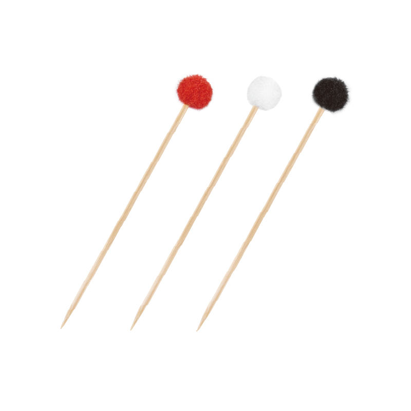 Ajoutez une touche festive et élégante à vos présentations culinaires avec le pic bois pompon. Disponible en trois couleurs : rouge, blanc et noir, ce pic de 9 cm est parfait pour rehausser l'apparence de vos amuse-bouches, desserts et cocktails.