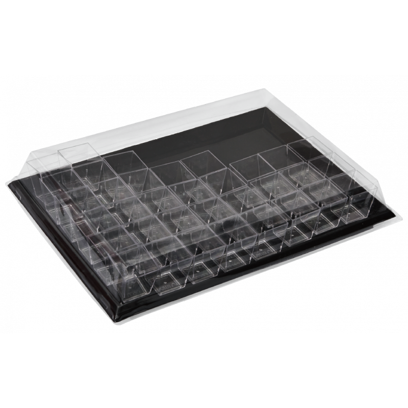 Ses dimensions de 38.1x27.5xH2.4 cm en font un présentoir de belle taille puisqu'il peut accueillir jusqu'à 48 verrines carrées.