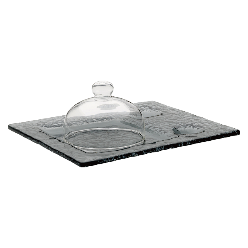 Petite cloche en verre transparente avec poignée idéale pour mettre en avant un met et protéger celui ci des désagréments externes.
