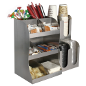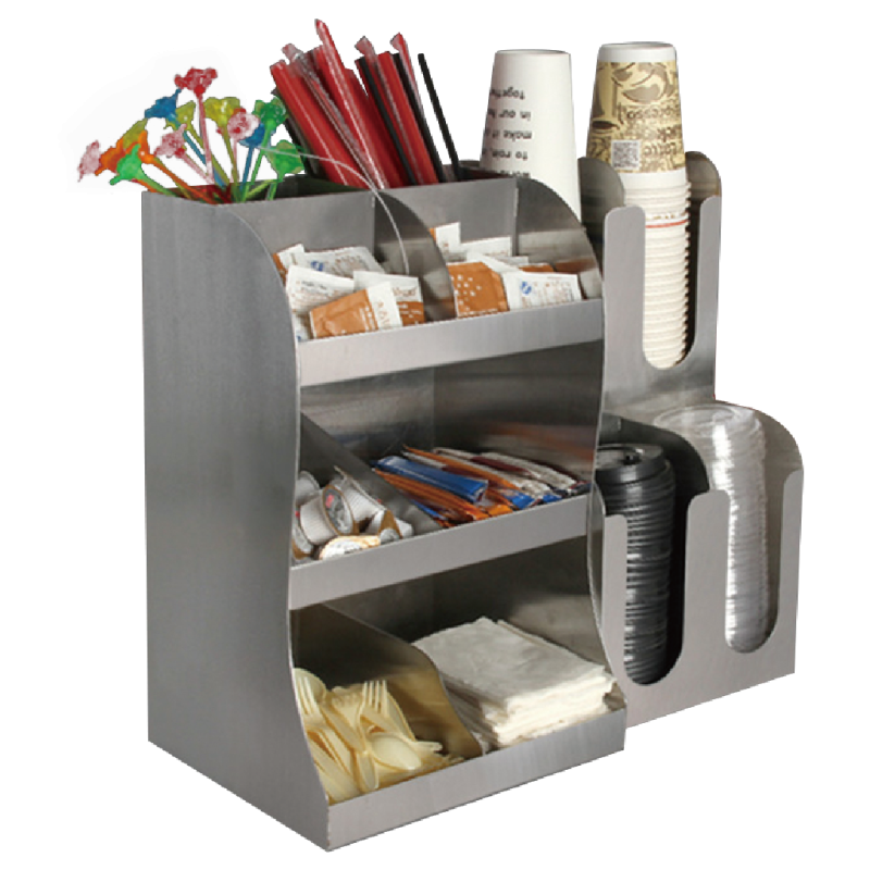 Présentoir en inox adapté pour y mettre des gobelets de différentes tailles avec couvercles, des agitateurs, des pailles, serviettes, cuillères, dosettes de sucre ...