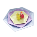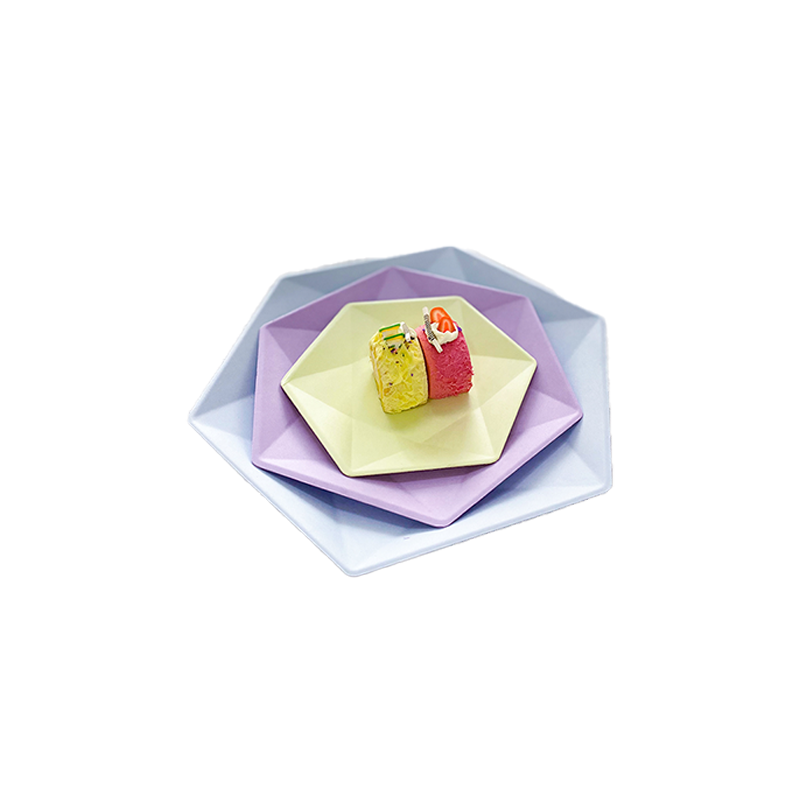 Assiettes colorées au format hexagonale en pulpe de canne, robustes et compostables. 4 couleurs dans un carton : vert, bleu, violet et rose.